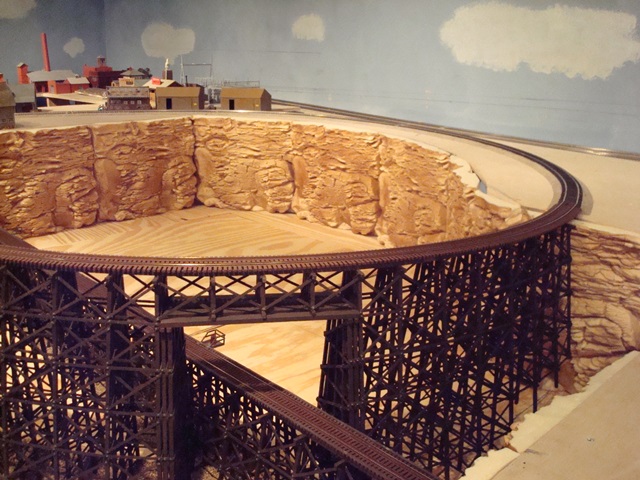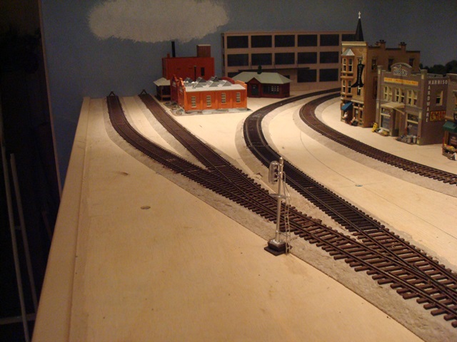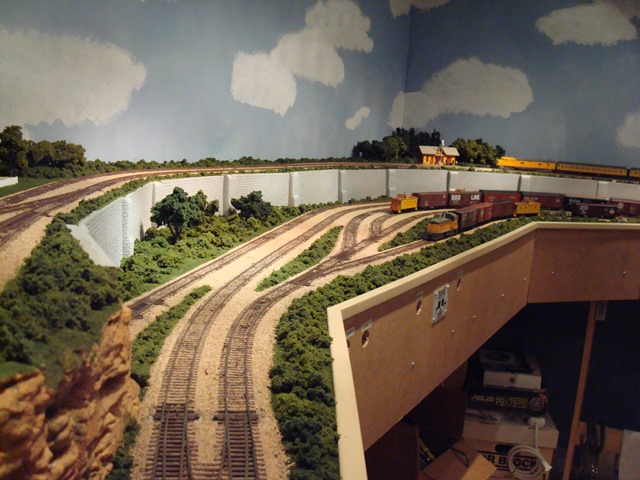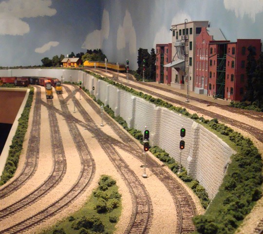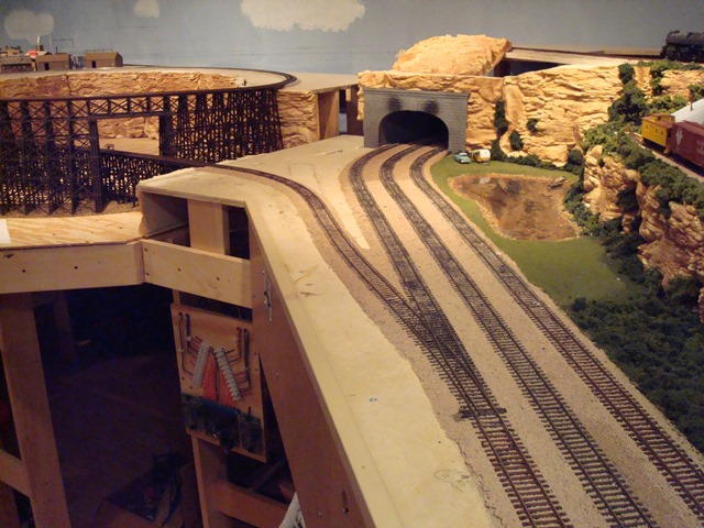 Leaving the Garrison area the Westbound track continues on the mid-level behind and above Broken Bow, around the peninsula, back around Broken Bow and arrives at the lower tunnel portal in at which point it enters a three-way turnout and three independent reverse loops.