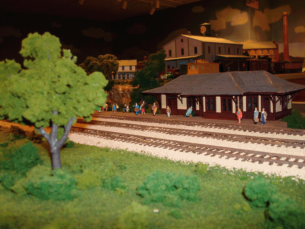 Many trains arrive and depart Broken Bow yard. Arrivals are broken down and constructed for various destinations on the railroad. The first photo shows the two trains that remain overnight and are the first to leave each morning. Twice daily passenger trains arrive from Calgary and return. The track at the edge of the table is cleared during these arrivals as it is the inbound track for the passenger train. The fourth track from the left is the Eastbound Mainline and the track next to the stone wall is the Westbound Mainline. There are four double slip switches to facilitate movement from the Mainline and within the yard. The three left tracks curve as shown in the middle picture to the passenger station and two storage tracks as shown in the second photo. The third photo is the Broken Bow Passenger Station. |