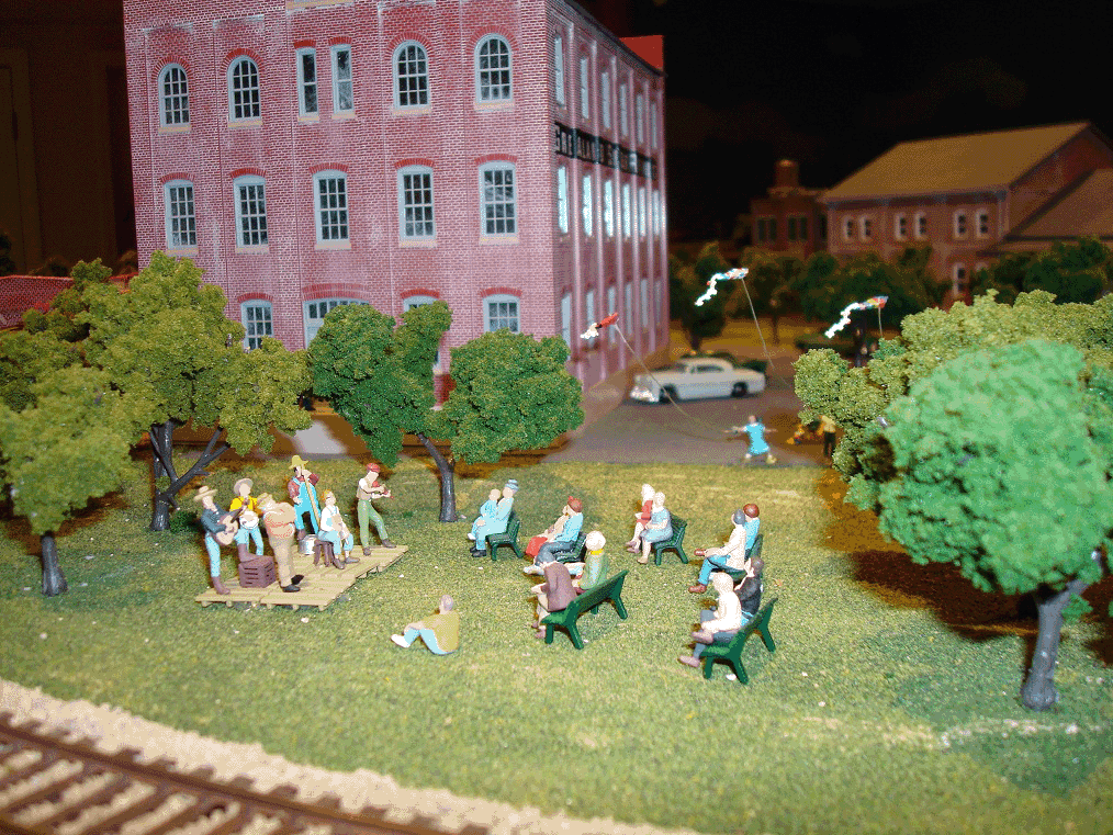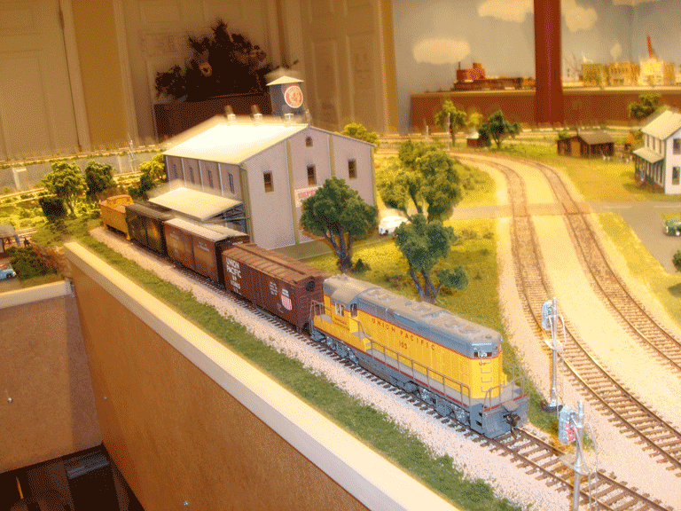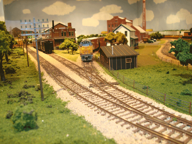 Continuing Eastbound around the peninsula from Benning you pass the backside of the Greatland Sugar Refinery. They are having a family day with a jug band and the kids flying kites. Next you pass the grade crossing at Red Deer with fully operational gates and flashing lights. The third photo shows the three stub tracks at Red Deer. The right stub goes to the Greatland Sugar refinery. A load of sugar beets arrive daily and empties are returned. The center track is for the C.M. St. P.&P. It is a freight house that transfers partial loads to waiting trucks. From here deliveries can also be made to the Spooner Sash & Door Co. A switcher has its home here and moves the empties from these two tracks to the left track for pickup. These empties are delivered back to Broken Bow for distribution. |