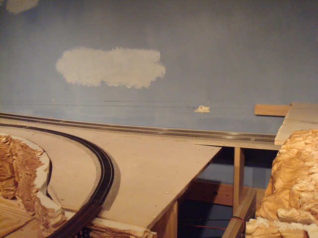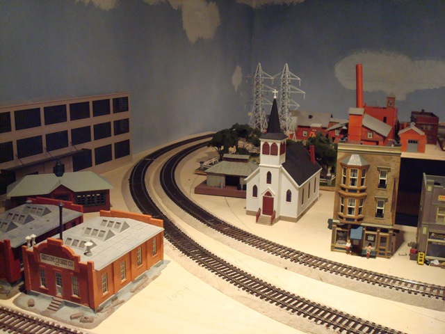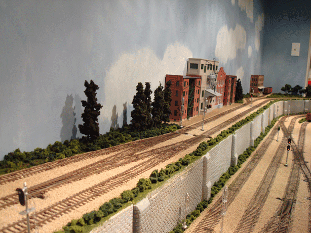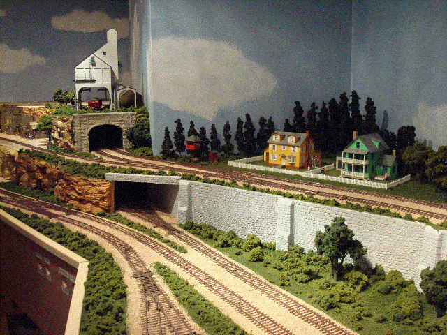 After leaving Nimrod, a train reenters the mid-level tunnel portal on the Westbound track in the first photo. It travels along the back wall to reemerge on the mid-level left track of the center photo. In the center photo the spur on the second level is Garrison as shown in the third photo. |