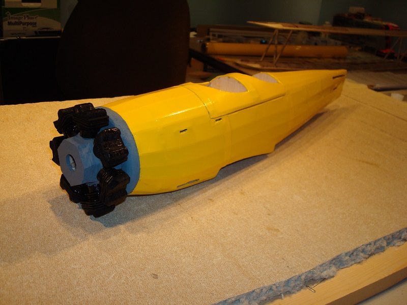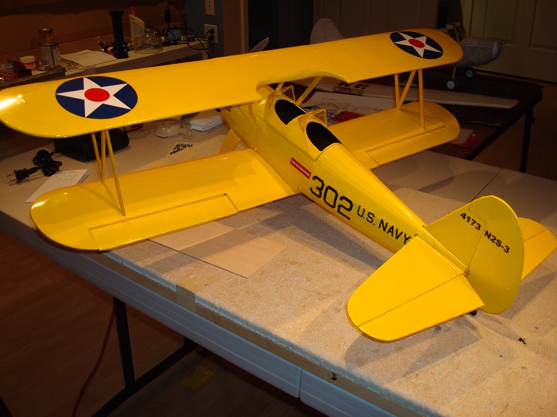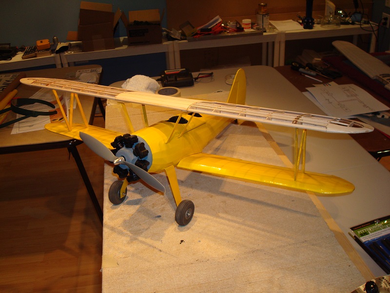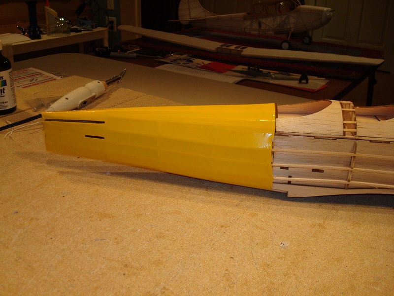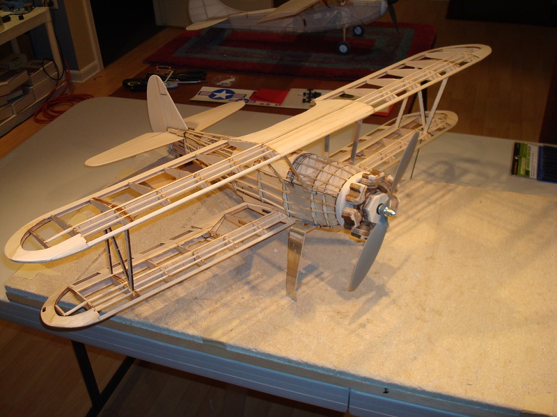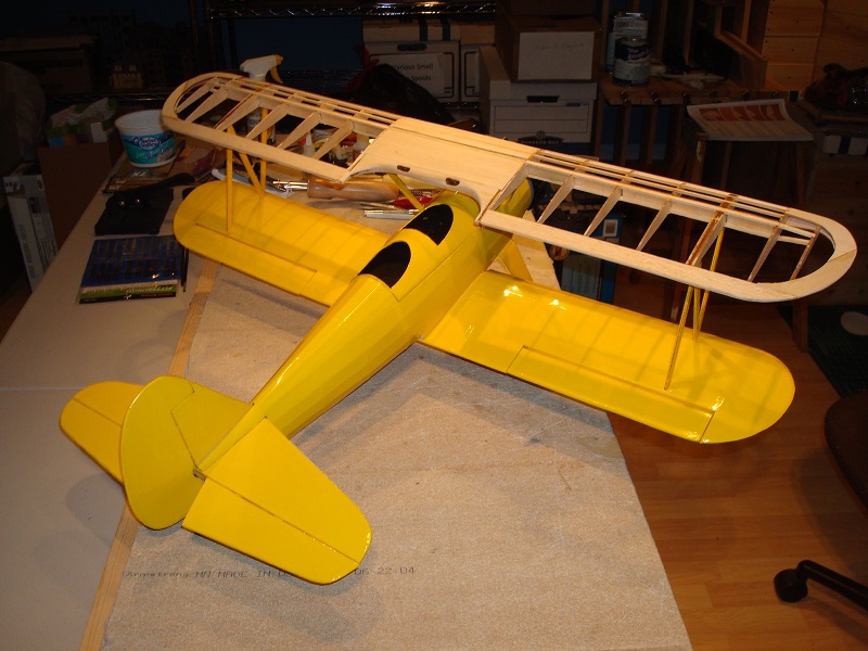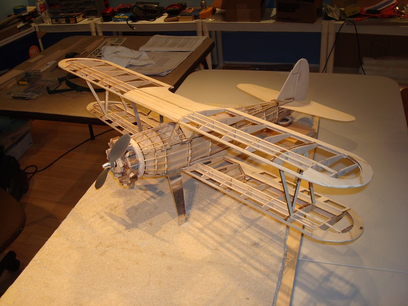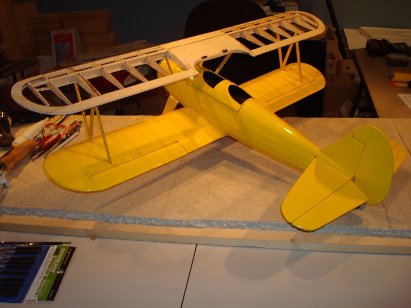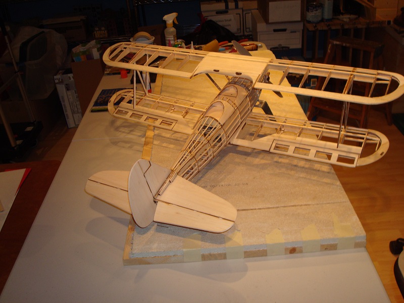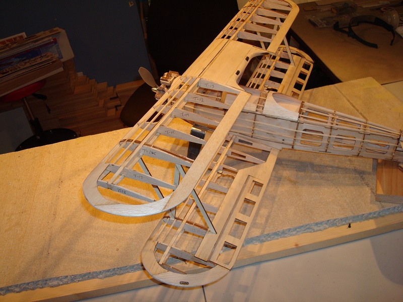Landing gear added. Also lower wing with ailerons. "N" braces and the cabanes are temporarily in place to hold upper wing. |