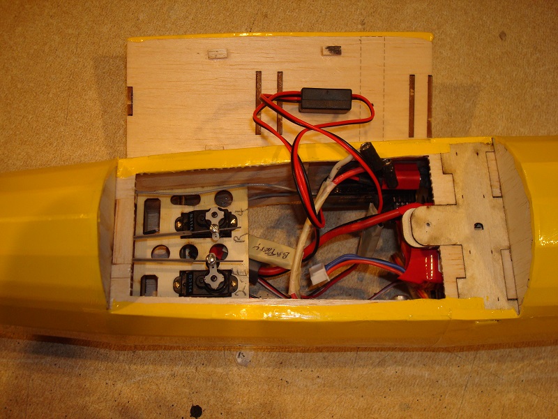 Wiring and servos below the removal dual cockpit. The rudder (R) is channel 4 and the elevator (E) is channel 2. The motor control is channel 3 and the ailerons are channel 1. Notice on/off switch in cockpit floor. |