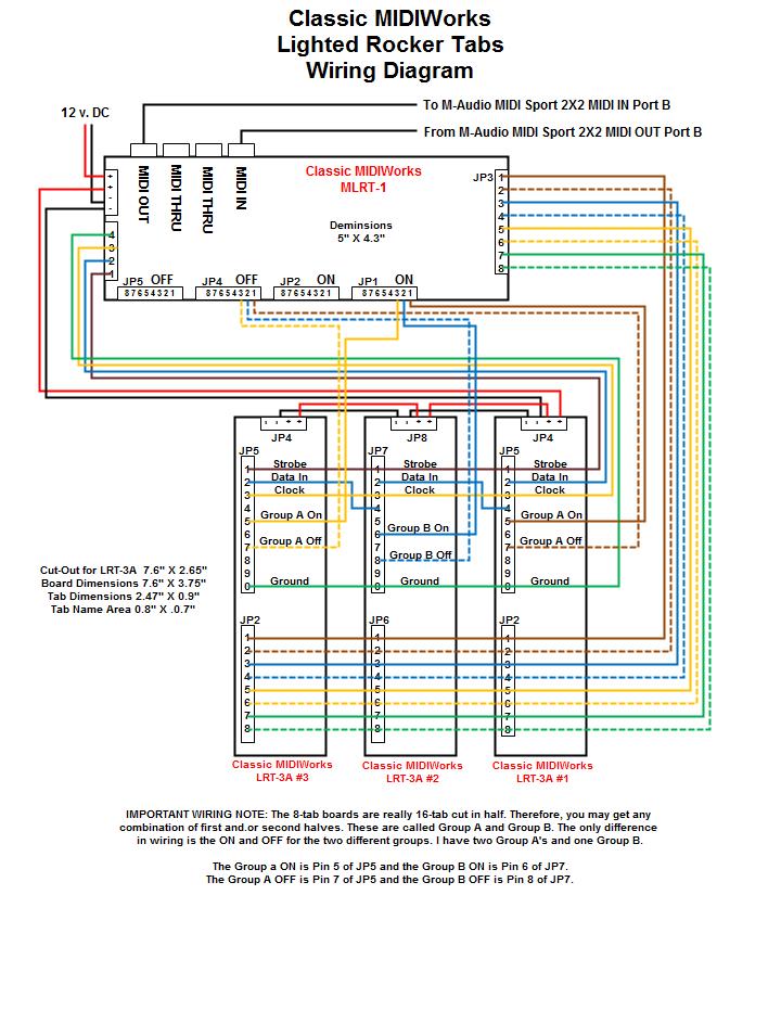 I ordered 4 - 8 tab LRT-3A's and 1 - MLRT-1 from Classic MIDIWorks. You can see how I installed them in the console section. The 8 tab boards are actually 16 tab boards cut in half. There is an A Group and a B Group on each 16 tab board. When wiring boards with 8 or less tabs, it is very important to know if you have an A or B Group. A Group boards can be identified with the power input located on one corner of the circuit board. The B Group power input is offset from one corner.